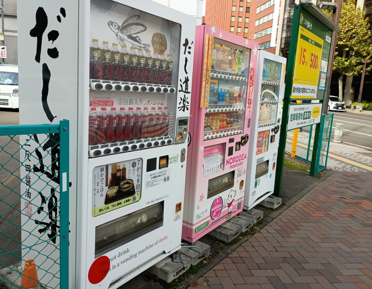 札幌市で見つけた面白い自販機を2つご紹介します♪自販機スポンジ1つ目はダスキンのスポンジの自販機です。私がこの自販機を見つけた場所は東区北17条東5丁目にある「ダスキン北17条支店」の前です。自販機スポンジ台所用スポンジから浴槽用スポンジ、レンジ周りのふきんなどダスキンの人気のお掃除用スポンジをなんと自販機で購入することができますよ。自販機スポンジカラーもシックなブラック系から明るいビタミンカラーまで揃っていて気分に合わせて選べるのも魅力です。また自販機の下の方に「DUSKEN」とワンちゃんの手形がついているのもとっても可愛いです♪自販機スポンジもう一つは「三井のリパーク」札幌北3西2駐車場の前にある「だし道楽」の自販機です。自販機スポンジ「だし道楽」の自販機は札幌の街中でよく見かけるので、気になっていた方も多いのではないでしょうか。長崎県近海で漁獲される「とびうお」のことをこの地方では「あご」と呼ぶそうです。とびうおが丸ごと入っているだしのボトルは思わず「えっ!?」と二度見してしまいそうですね!自販機スポンジ最近は面白い自販機が本当に増えてきました。街中で見かけたら、ぜひ立ち寄ってみてくださいね。