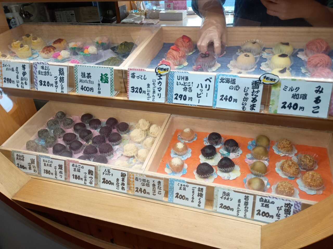 ショーウインドウにはいつもの見慣れたおはぎとは全く違うとてもフォトジェニックなおはぎが並んでいました。お花の形をしたものやイチゴが入っているもの、モンブランのようなおはぎなどお土産にもピッタリですね!