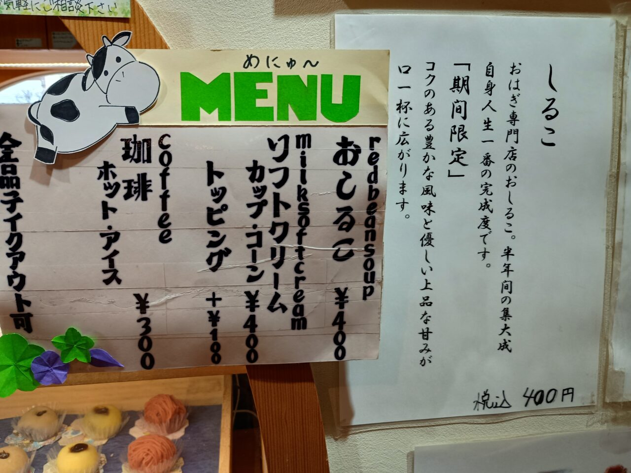 おはぎ専門店ですが「おはな」ではおしるこやソフトクリームも扱っています。生乳を使ったソフトクリームや上品な甘みの特製おしるこは大人気ですよ。